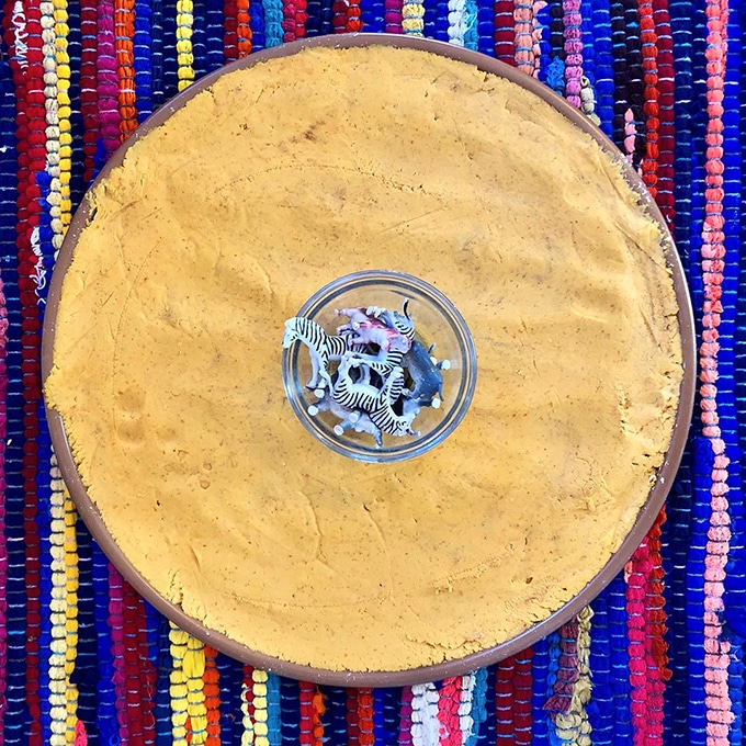 Mélanger 1 tasse de purée de potiron avec 1,5 tasse de fécule de maïs. Ajustez à votre convenance en fonction de la fermeté ou de la souplesse que vous souhaitez obtenir. Ajoutez des animaux en plastique (ou d’autres jouets de saison) pour faire des empreintes !