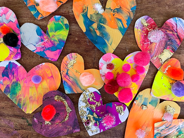 Ils sont tellement amusants à faire, petits ou grands. Nous avons peint de grands cœurs avec des enfants en bas âge lors de cours d’art et nous avons fait de petits cœurs pour les valentins de la classe. Commencez par du carton et de la peinture, puis ajoutez des pompons, des paillettes, des sequins, du papier découpé, des pailles, etc.
