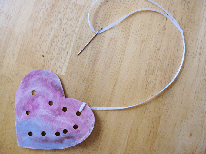 Découpez des cœurs et peignez-les. Demandez ensuite aux enfants de percer des trous et de coudre le cœur.