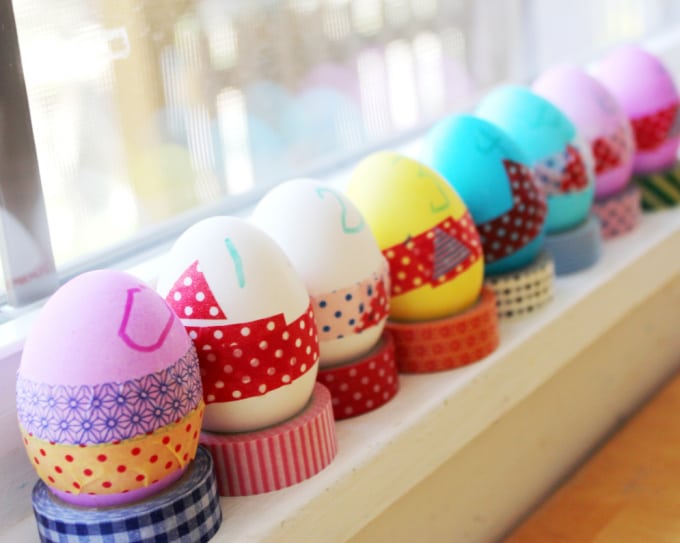 Utilisez du washi tape sur des œufs teints ou non pour ajouter un motif coloré et facile à réaliser. Bonus : un rouleau de washi tape fait parfaitement office de porte-œuf !