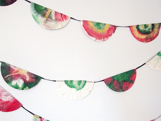 Utilisez des aquarelles liquides aux couleurs de Noël pour peindre des filtres à café. Enfilez-les ensuite pour créer une guirlande de Noël festive !