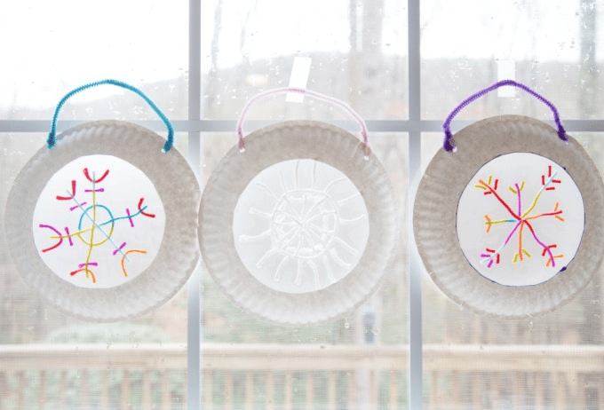 Créez des flocons de neige collants avec du fil et du papier de contact ! Une alternative amusante et facile aux flocons de neige en papier pour les enfants.
