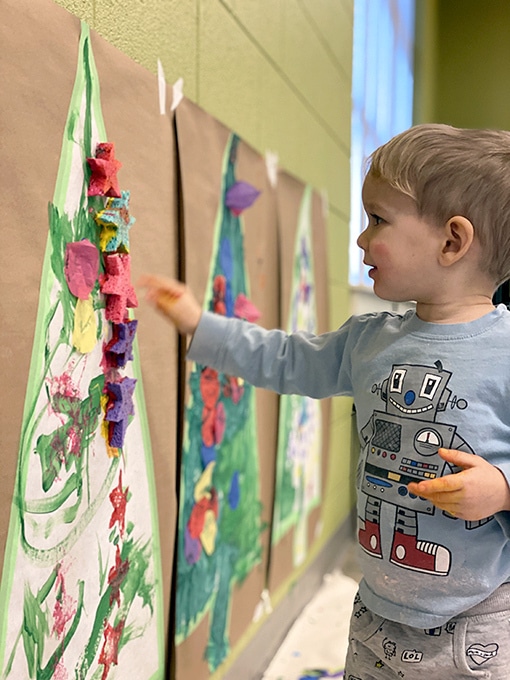 Les petits enfants apprécieront particulièrement de peindre de grands arbres de Noël en papier ! Ajoutez des ornements faits de papier de soie ou de pompons et d’autres matériaux de bricolage.