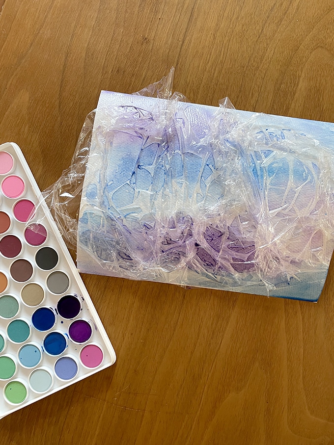 Une fois que le papier est recouvert de belles couleurs, froissez un grand morceau de film plastique sur la peinture.
