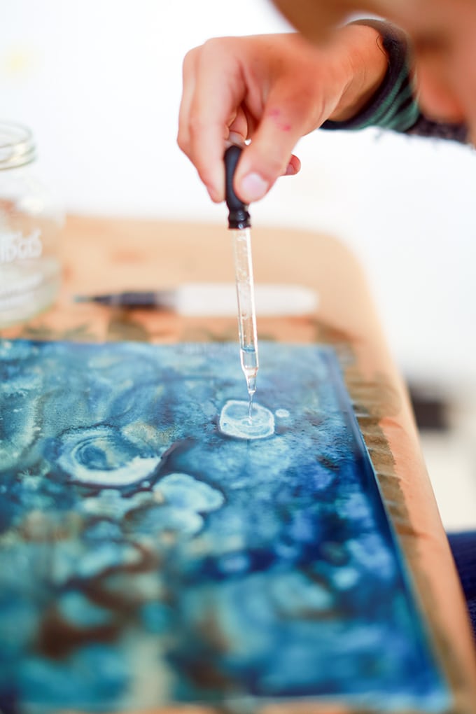 Une fois que le papier est bien saturé de peinture aquarelle, utilisez une pipette pour transférer de l’alcool à friction sur la peinture. Pressez et aspergez tout le papier et regardez les couleurs se mélanger. Cette étape a suscité beaucoup d’enthousiasme chez nous !