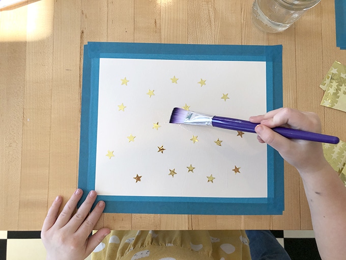 Pour créer une peinture de galaxie, ajoutez d’abord des autocollants d’étoiles en feuille d’or sur votre papier aquarelle.