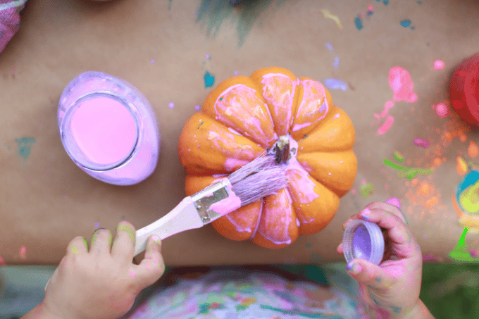 Peindre avec des citrouilles est facile : donnez à chaque enfant une citrouille, de la peinture, des pinceaux (ou laissez-les peindre avec leurs doigts !) et, si vous êtes courageux, des paillettes !