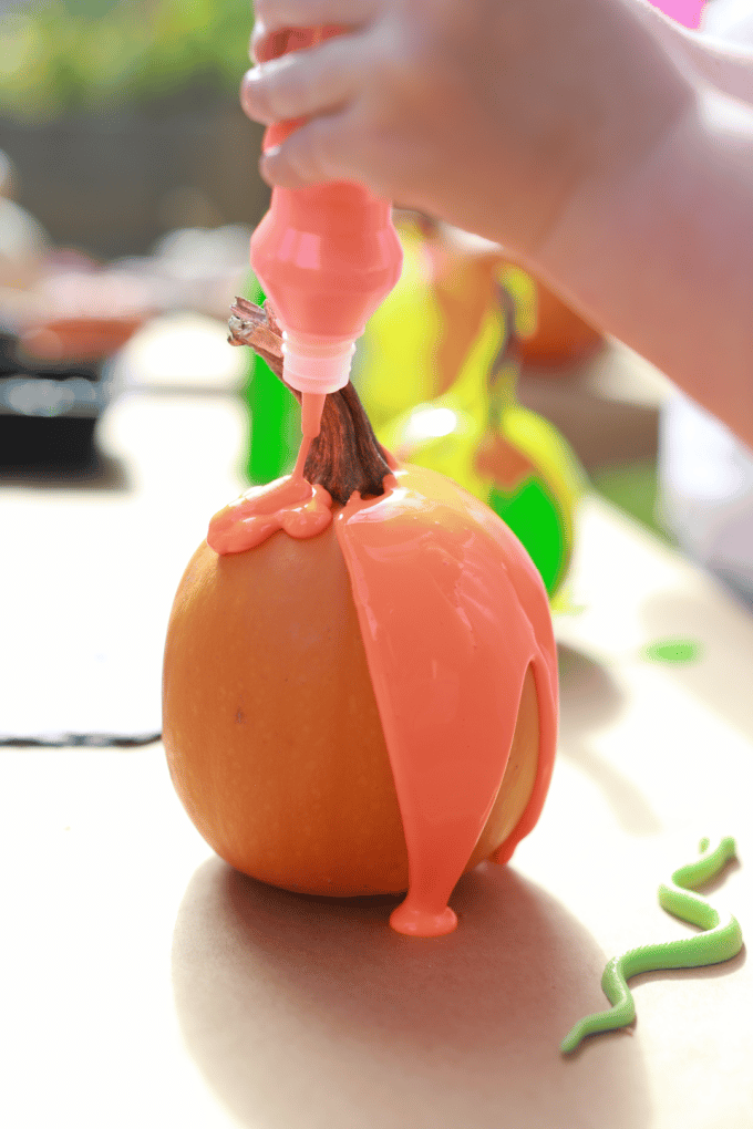 Une fois que vous avez essayé la peinture de base, vous devez essayer la peinture à presser ! Les flacons à presser sont tellement faciles et amusants à utiliser pour les enfants. Il suffit de laisser votre enfant presser la peinture sur la citrouille, de la laisser couler et se mélanger aux autres couleurs.