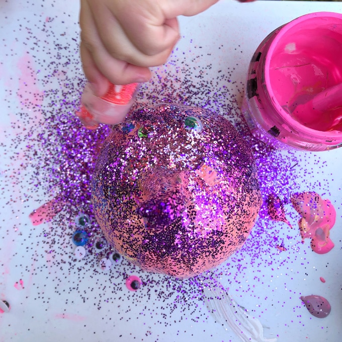 Une autre option de peinture amusante à essayer est la peinture acrylique diluée et les paillettes. Vous pouvez peindre ou verser de la peinture sur les citrouilles, puis ajouter des paillettes pendant que la peinture est encore humide ! Il est préférable d’essayer ce projet à l’extérieur, car les enfants peuvent se montrer assez libéraux avec les paillettes !