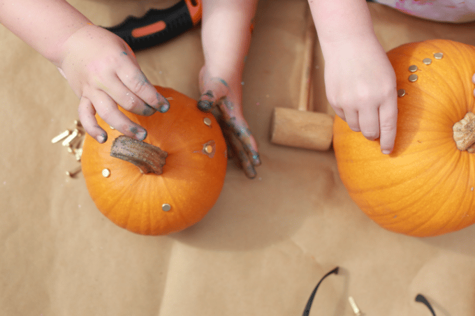 Ce projet est amusant une fois que la peinture a séché ! Utilisez un marteau ou un maillet et enfoncez des tees de golf ou des attaches en laiton dans votre citrouille. Les enfants adorent avoir l’occasion de marteler, et nous adorons l’aspect des pois sur toute la citrouille !