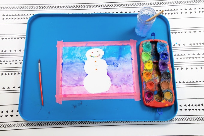 Tous les enfants adorent le ruban adhésif et les autocollants, alors cette technique de résistance à l’aquarelle est très amusante. Utilisez du ruban adhésif ou des autocollants (ou les deux !) pour créer une image, peignez sur toute la page, puis retirez les autocollants pour révéler une jolie silhouette !