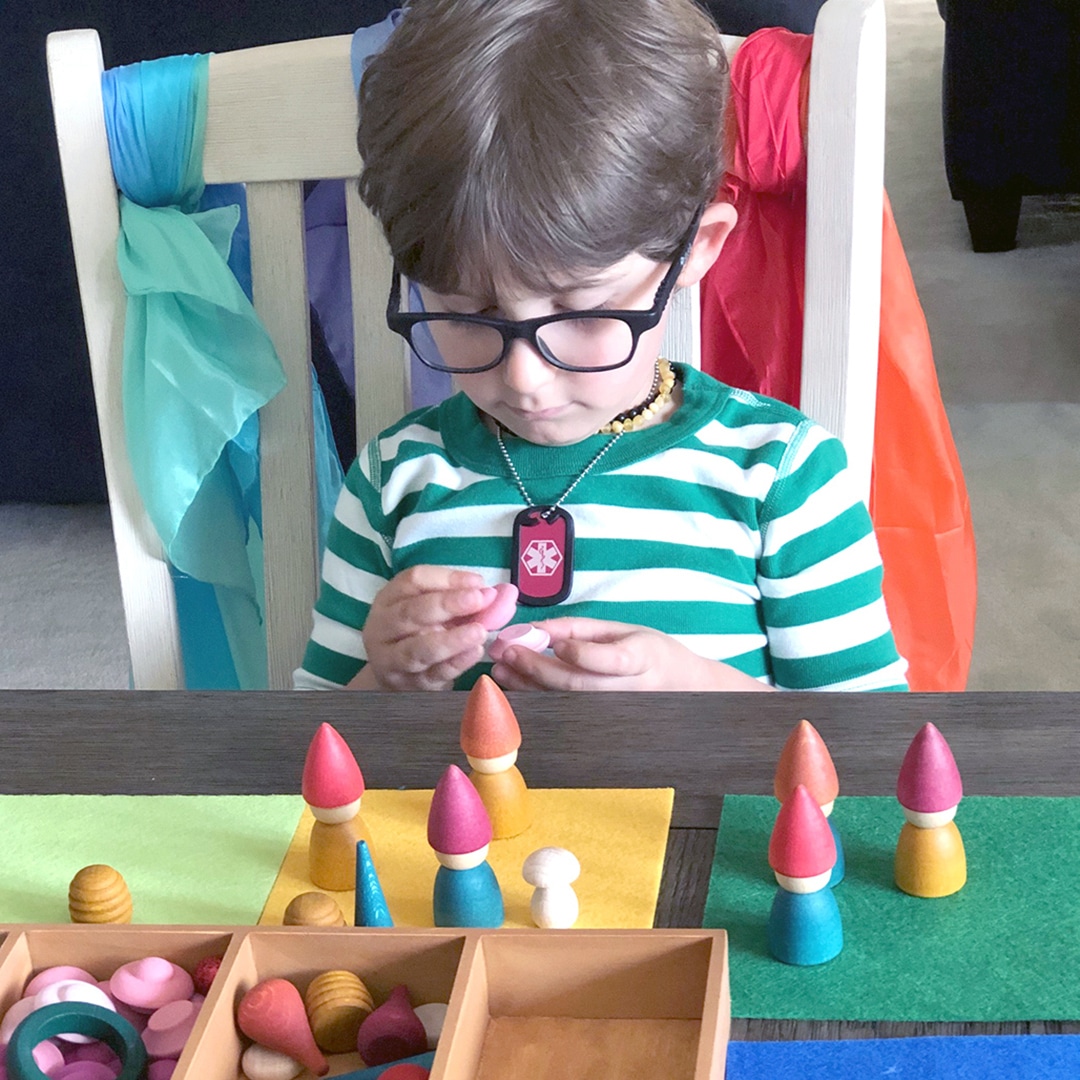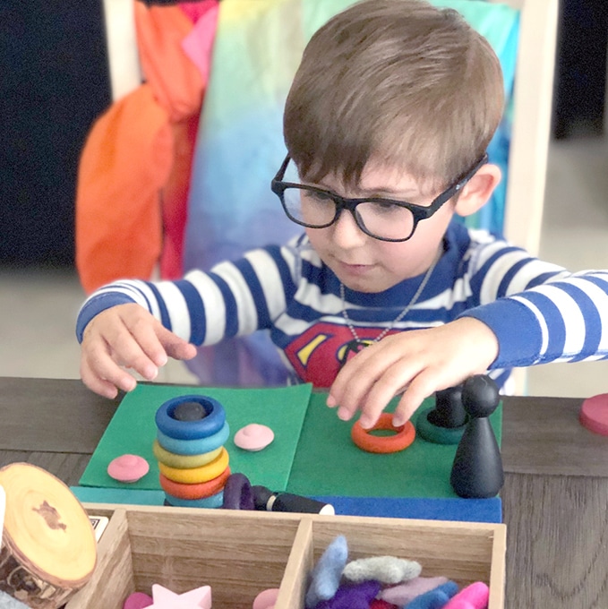 Mon fils a adoré le plateau de pièces détachées en bois que j’avais préparé pour lui. Je me suis assise à un bout de la table de notre salle à manger pour travailler, tandis qu’il était assis à l’autre bout, heureux d’empiler des arcs-en-ciel, de mettre en place ses personnages et ses anneaux d’empilage, et de raconter ce qu’il faisait.