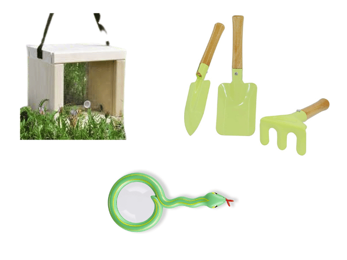 Donnez à vos enfants les outils nécessaires pour explorer l’extérieur ! Restez simple et ils s’amuseront à creuser et à observer. Voici quelques exemples d’articles que vous pouvez inclure :