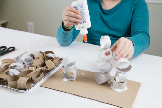 - Placez ces matériaux dans une grande boîte avec du ruban adhésif et un pistolet à colle et aidez-les à construire comme ils le souhaitent. Laissez-les décorer avec des marqueurs et/ou de la peinture au fur et à mesure ou lorsqu’ils ont terminé leur construction.