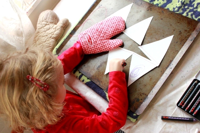 Maia a également fait cette activité, mais elle a donné sa propre tournure aux chignons aux crayons de couleur fondus. Elle a « peint » les triangles de papier avec le crayon à faire fondre, recouvrant d’un arc-en-ciel de couleurs unies tous les triangles, à l’exception de la bande la plus fine du haut. Ainsi qu’un triangle spécial contenant toutes les couleurs de l’arc-en-ciel.