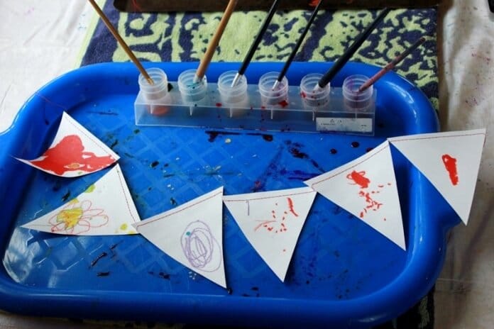 Découpez le papier en triangles et cousez-les ensemble sur le dessus à l’aide d’un point de bâti à la machine à coudre. (Ou, si vous préférez, vous pouvez les coller le long d’un ruban d’un quart de pouce).