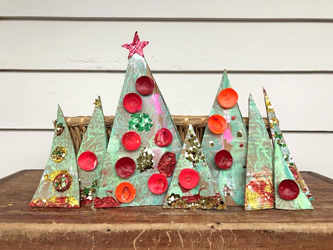 Le plus beau dans ce projet d’arbre de Noël, c’est qu’il utilise essentiellement des matériaux recyclés. Une année, nous avons même réutilisé des taches de peinture séchée qui ont fait (involontairement) de superbes petites décorations pour les arbres. Nous avons également ajouté des étoiles pailletées qui ont vraiment fait briller ces arbres !