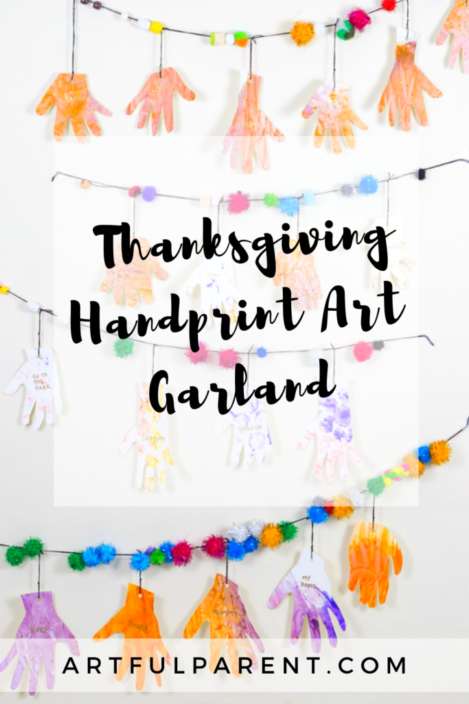 Associez des empreintes de mains peintes au doigt à des pompons festifs pour créer une guirlande artistique d’empreintes de mains de Thanksgiving pour les enfants.