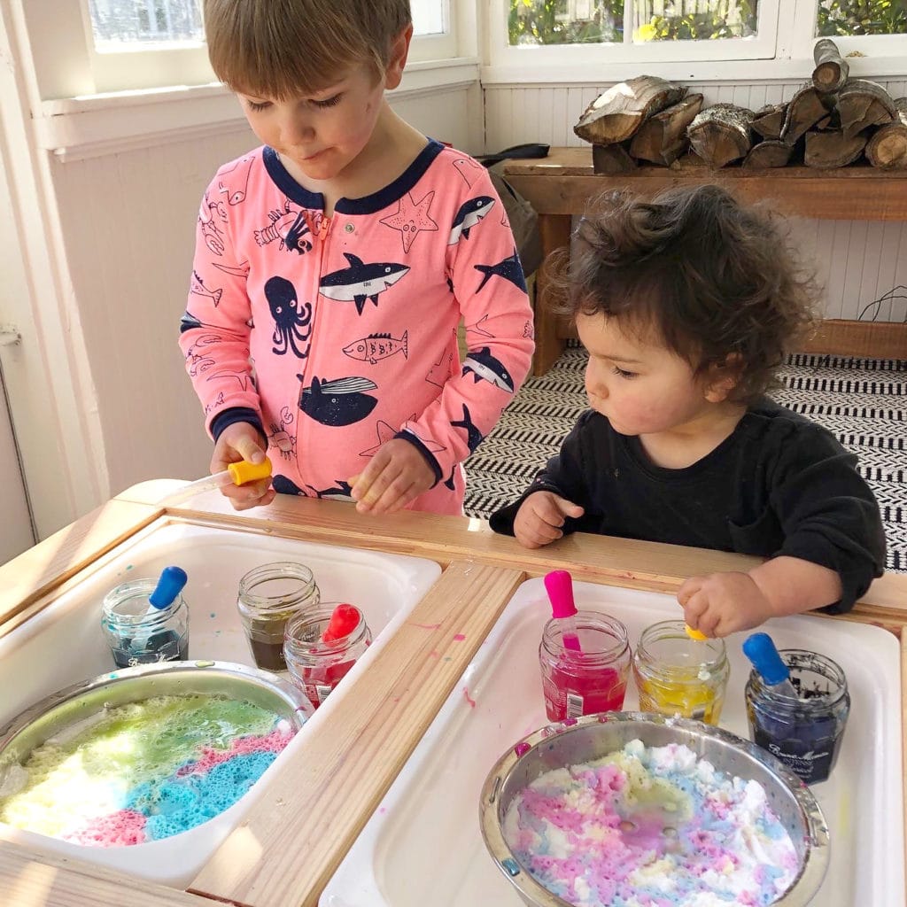 Nous revenons sans cesse à cette expérience scientifique simple pour les enfants. La plupart du temps, j’en fais une simple activité de mélange de couleurs en colorant le vinaigre. Les couleurs se mélangent et pétillent, et nous regardons tous avec plaisir les nouvelles couleurs apparaître.