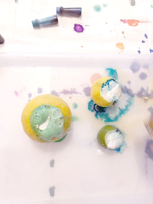 J’adore ce projet qui allie l’art et la science. De plus, il est TELLEMENT simple à mettre en place. Et bien sûr, il y a tellement d’options différentes pour développer ce projet, comme des volcans de pâte à modeler en éruption ou une potion pétillante.