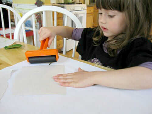 Étape 1 : Nous avons mis de la peinture pour tissu sur un cadre en acrylique (mais vous pouvez aussi utiliser une assiette) et nous avons fait rouler notre mini rouleau de peinture (le nôtre vient d’une quincaillerie) dessus plusieurs fois. Lorsqu’il était imbibé de peinture pour tissu, nous l’avons fait rouler sur une feuille. Vous pouvez faire cela sur du papier journal ou du papier brouillon pour protéger votre surface de travail.