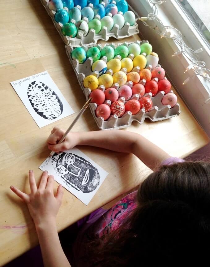 Si vous le souhaitez, vous pouvez colorier les motifs des œufs de Pâques avec des marqueurs ou des crayons de couleur, comme l’a fait Daphne ici. Les filles en ont envoyé quelques-uns en noir et blanc et en ont colorié d’autres qu’elles ont livrés à une amie hospitalisée. Les deux étaient adorables.