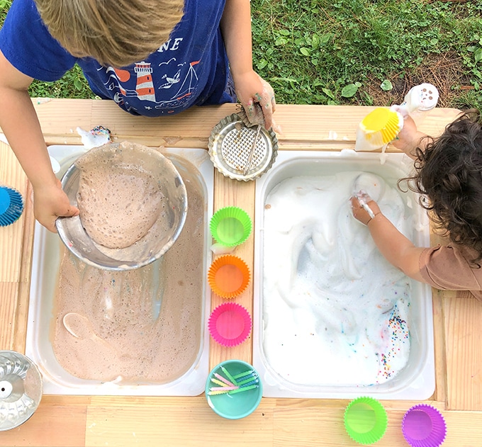 Cette activité sensorielle a également tout ce qu’il faut pour devenir un jeu salissant. Pour cela, il suffit d’un peu d’eau et de quelques giclées de liquide vaisselle. Une fois mélangé, le mélange doit devenir agréable et épais.