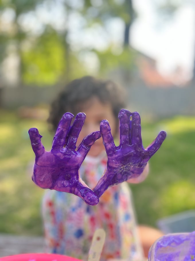 Le slime est également facile à fabriquer à la maison ! De plus, c’est une matière sensorielle formidable à tenir, à presser, à étirer et à manipuler. Une matière sensorielle très amusante à mélanger à la maison pour les grands enfants. Et n’oubliez pas d’essayer ensuite Comment faire des créations de Slime pour les enfants.
