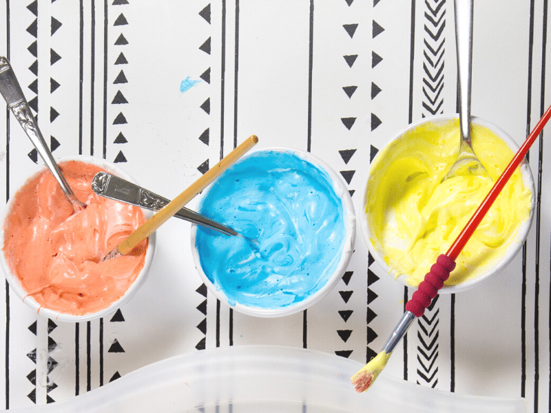 - Peinture comestible facile avec du yogourt Ajoutez du colorant alimentaire au yogourt et mélangez jusqu’à ce que le colorant soit incorporé. Ce produit peut être utilisé comme peinture à doigts dans la chaise haute et est également (bien sûr) sans gluten. C’est une bonne façon de commencer à peindre avec les doigts lorsque les bébés explorent les matériaux avec leur goût.