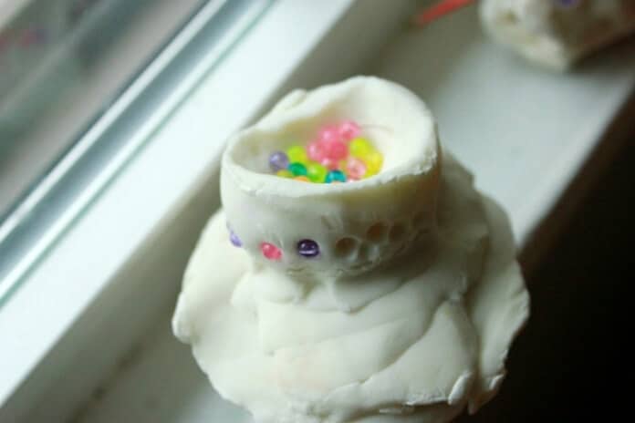 Elle a ensuite fabriqué un couvercle et ajouté un autre petit bol sur le dessus, qu’elle a décoré de perles, avant de le remplir avec encore plus de perles.