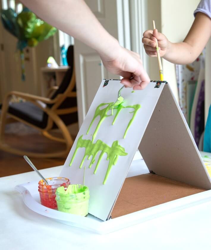 Si vous réalisez cette activité à l’intérieur, je vous recommande vivement de placer le chevalet en carton au-dessus d’un plateau ou d’un tapis pour récupérer les gouttes de peinture.