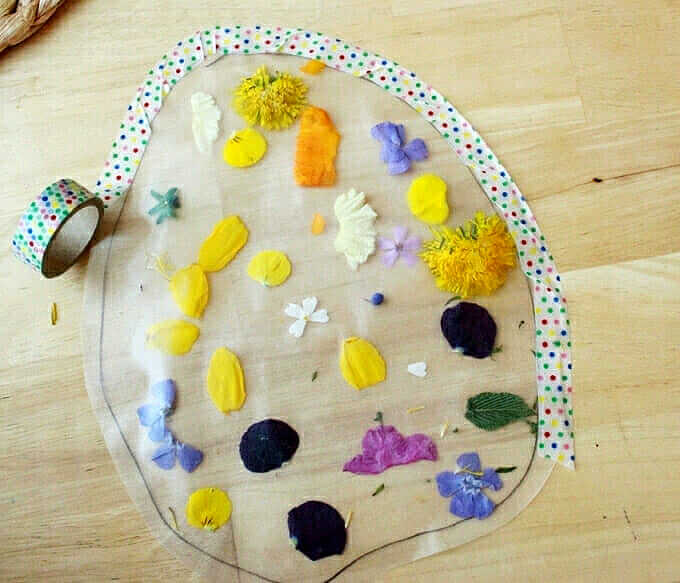 Note : : Nous utilisons généralement des pétales de fleurs au lieu de la fleur entière parce qu’ils sont moins susceptibles de se décomposer. Si vous utilisez une fleur entière, surtout si elle est grande ou épaisse, elle semble se décomposer plus rapidement. Quoi qu’il en soit, ces attrape-solaires sont éphémères et les fleurs se faneront, voire se décomposeront avec le temps.