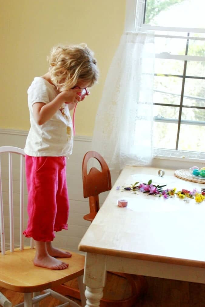 Daphné cueille déjà des fleurs plusieurs fois par jour et nous les livre sur nos bureaux, nos tables ou dans nos poches. J’ai l’habitude de transférer ces doux cadeaux dans de l’eau, mais j’ai décidé qu’il était temps de faire des attrape-soleil avec des fleurs.