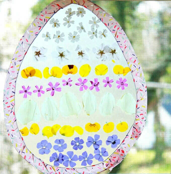 Ce projet d’œuf de Pâques pour enfants est une combinaison de deux de nos attrape-soleil de printemps préférés. Il utilise des pétales de fleurs printanières et du papier contact pour créer une belle vitrine.