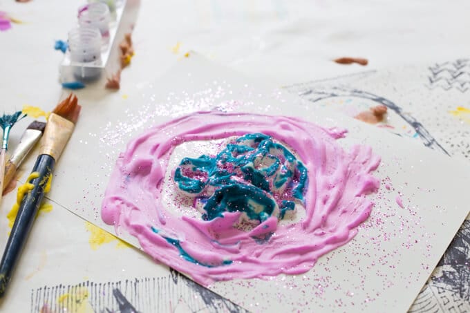 Si vos enfants sont comme les nôtres, ils voudront à un moment donné recouvrir leurs mains et leurs bras de mousse colorée. Conseil : gardez un bol d’eau et quelques chiffons à proximité pour que les enfants puissent se laver si nécessaire.