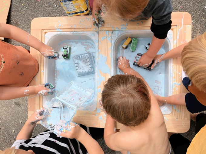 Parfois avec des groupes d’art pour les tout-petits, parfois seuls, parfois à l’occasion de fêtes d’anniversaire. Nous l’avons fait à l’intérieur et à l’extérieur, en petites quantités ou en grandes quantités, en jouant souvent avec nos mains, nos outils et même nos pieds.