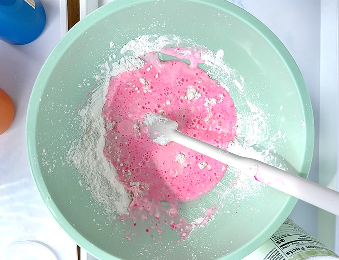 - Essayermélange de couleursavec ! Vous pouvez soit ajouter le colorant alimentaire à de l’oobleck blanc, soit mélanger deux couleurs de ce produit.