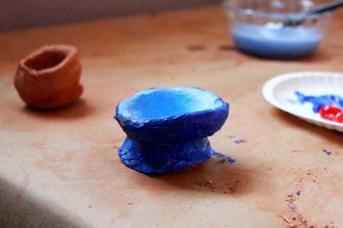 Créez de petits bols et de petites tasses avec un kit de tour de poterie pour enfants. Faites-les sécher à l’air libre (pas de four domestique ici) avant de les peindre.